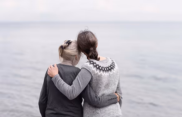 Smiling young woman with long brown hair wearing a white sweater outdoors with mountains and sky in the background.
